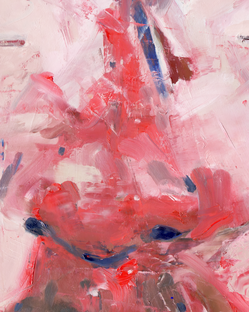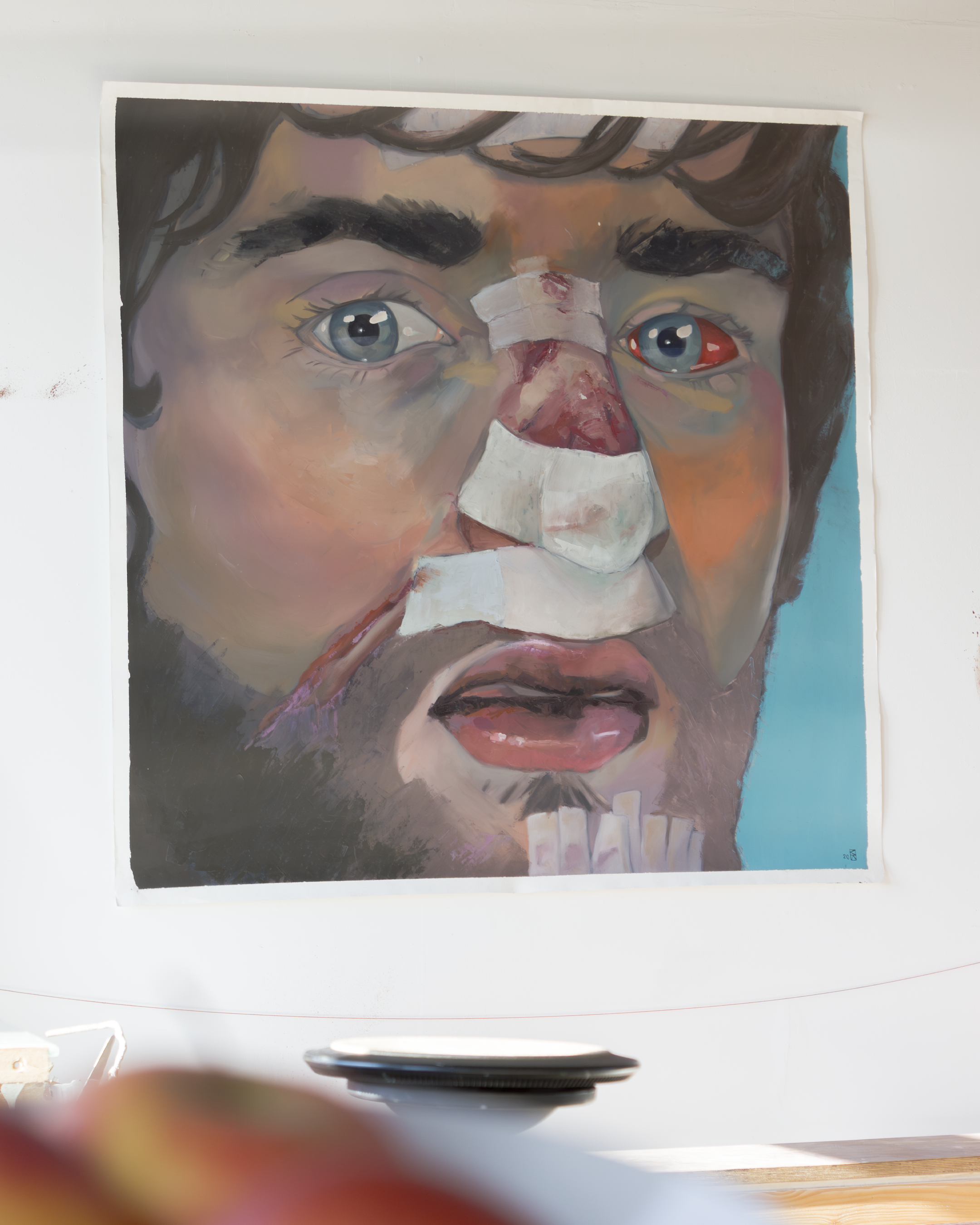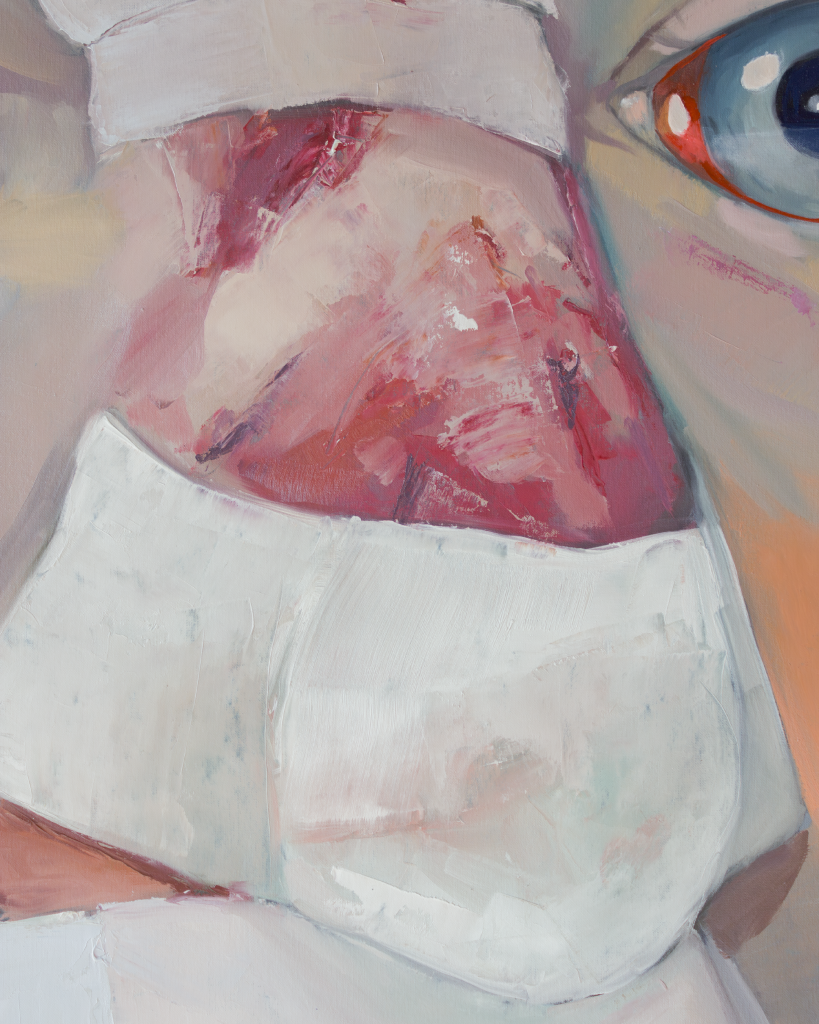 While the first painting can be viewed as symbolic and by that holding beauty within. The second painting, –this one–, is raw. Stripped away are the things that where fake (the bloody eye never happened). They may have been necessary to be able to handle the shame associated with what happened. Make it more dramatic in order to look at it from a higher vantage point. This time around the artist felt more at ease with his past, more one with what he was, has become and where he may go next. Therefore this painting is far more direct in its approach. No need for beauty. Show the uglyness, accept it. Let the painting bleed.